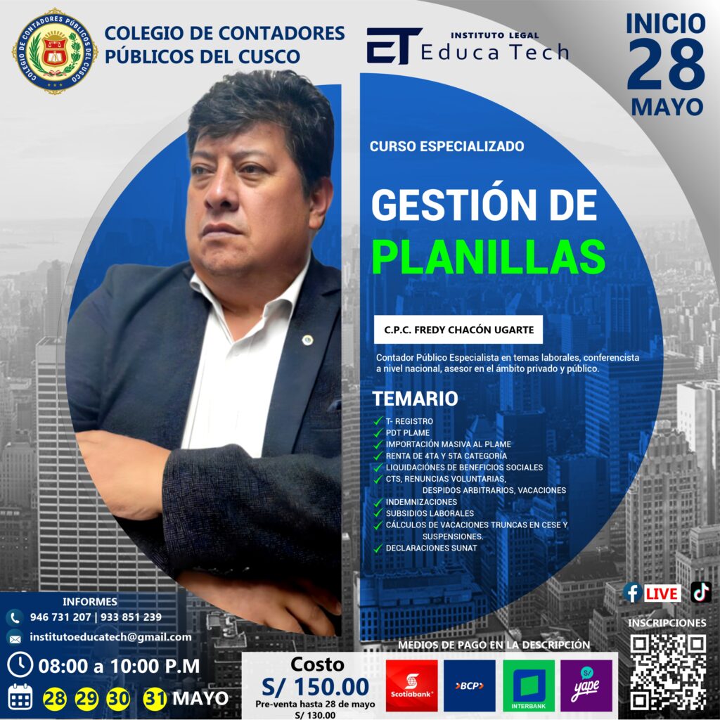En el marco del convenio de cooperación académica entre el Instituto Legal Educa Tech (ILET) y el Colegio de Contadores de Cusco, se organiza el Curso Especializado en Gestión de Planillas 2025, con el objetivo de brindar capacitación técnica y actualizada a los profesionales contables de la región.